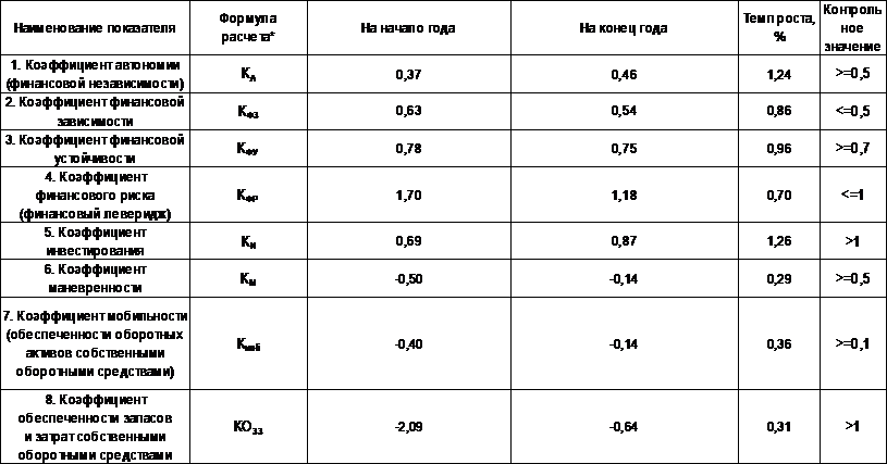 В какой степени используемые предприятием активы сформированы за счет собственного капитала, показывает коэффициент автономии, изменившийся по сравнению с началом периода с 0,37 до 0,46. Данный показатель характеризует долю собственного капитала в структуре капитала предприятия. Рекомендуемое значение более 0,5. Таким образом, финансирование деятельности на нашем предприятии к концу года осуществляется на 46% из собственных источников и свидетельствует об росте финансовой независимости. Сокращение коэффициента отражает тенденцию к росту зависимости предприятия от заемных источников финансирования хозяйственного кругооборота и поэтому оценивается отрицательно.