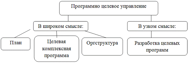 В узком смысле «сущность программно-целевого управления сводится только к разработке и реализации целевых комплексных программ различного типа, являющихся единым плановым документом, в котором отражены все особенности данного подхода». В современной теории образования находят отражение два основных вида программ. Это программы развития образовательных систем и образовательные программы, и те, и другие могут выступать в качестве целевых.