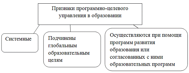 Таким образом, программно-целевое управление предполагает наличие цели, причем четко осознаваемой, и разработку программы по достижению этой цели. Поэтому при рассмотрении программно-целевого управления образованием особую роль играет единая программа развития образовательного учреждения или образовательной системы [6].