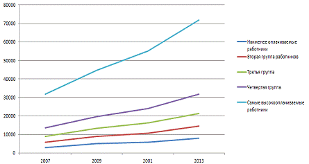 На графике, приведенном на рисунке 6, можно проследить динамику среднего заработной платы 5 групп населения за период с 2007 по 2013 г. [15]. По вертикали - месячный доход, руб.