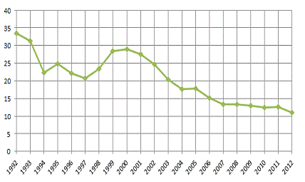 началось в 2000 году. По последним данным к 2012 году уровень бедности снизился