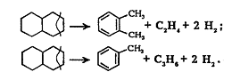 Цикланы и арены претерпевают реакции деалкилирования алкильных цепей, образуя алканы, алкены и цикланы с короткой боковой цепью. Шестичленные цикланы дегидрируются в арены, а последние подвергаются поликонденсации, образуя высокомолекулярные жидкие продукты.