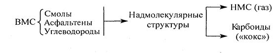 Если углеводородная дисперсионная среда высокоароматизирована и хорошо растворяет асфальтены, то по мере их конденсации не происходит их выделения из раствора, а образуется студень - трехмерная структурированная система, внутри которой находятся молекулы углеводородной среды (масла). "Кокс" образуется в результате дальнейшей сшивки этой структуры, при этом дисперсионная среда вытесняется.