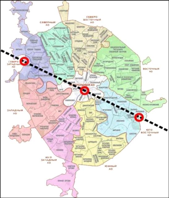 ось через центр города, соединяющая районы с наибольшими амплитудными