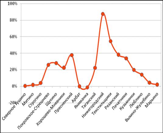 Глядя на график, можно наблюдать отрицательные значения изменения площади жилого фонда в центральных районах города (Арбат, Якиманка). Это говорит о том, что Генеральным планом планируется сохранение или незначительное уменьшение площади жилого фонда (около -1%) средствами реновации существующих застроенных территорий и ликвидации пятиэтажных домов. Также можно заметить, что по мере удаления из центра в районах, которые пересекает ТТК и ближайшие 2-3 километра от него, прирост жилого фонда, выраженный в процентном соотношении, имеет максимальные значения. Планируемое Генеральным планом увеличение площади жилого фонда составляет от 30 до 90%. В районе Щукино прирост жилого фонда составляет 28%, в районах Текстильщики и Рязанский 55 и 38%. В Нижегородском районе площадь жилого фонда планируется увеличить с 706 до 1 324 тыс. м2. В данном случае процентное увеличение равняется 88%. Таким образом, в районах СЗАО и ЮВАО, примыкающих к центральной части города, Генеральным планом запланировано формирование высокоплотных жилых зон с вкраплениями многофункциональных зон. Данное увеличение обусловлено большим количеством неиспользуемых по назначению промышленных зон, которые согласно основным мероприятиям генерального плана Москвы планируются к редевелопменту. Кроме того, в районах, удаленных на 6-8 км от центрального ядра города велик процент пятиэтажных домов первого периода индустриального домостроения, входящих городские целевые программы по сносу. Вышеперечисленные факторы являются резервом для уплотнения, которое согласно генеральному плану должно произойти.
