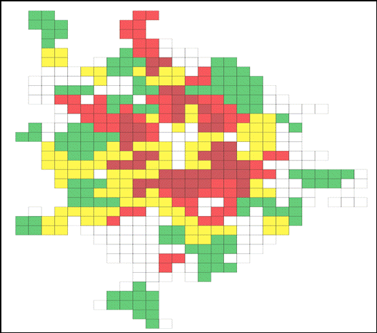 Далее обратимся к пространственному изменению площади жилого фонда по всей территории Москвы согласно Генплану. На рисунках 5 (Процентное увеличение площади жилого фонда Москвы согласно Генеральному плану.) и 6 (Трехмерная модель) на основании данных, полученных из таблицы 1 (см. приложения) построена карта процентного изменения площади жилья в зависимости от района города. Важно отметить, что на рисунках отображена не плотность жилой застройки, а величина процентного изменения. Как видно из этих двух схем, в центре города прирост жилья либо отрицательный, либо составляет менее 5 %, в то время как основное увеличение запланировано на территорию, примыкающую к Третьему транспортному кольцу. Именно там наблюдаются максимальное процентное изменение.