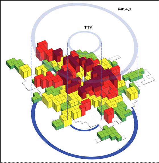 Таким образом, анализируя приведенные выше данные и наблюдения, можно выявить тенденцию, которую содержит Генеральный план относительно регулирования плотности жилой застройки в жилых зонах. И при анализе поперечного разреза по пространственной оси «Северо-запад, центр, юго-восток» и при ортогональном рассмотрении на карте прироста жилого фонда, можно отметить, что Генеральным планом города Москвы планируется значительное повышение плотности застройки жилых зон в зонах, примыкающих к центру, в то время как плотность центрального ядра города практически остается без изменений или имеет тенденцию к незначительному понижению плотности.