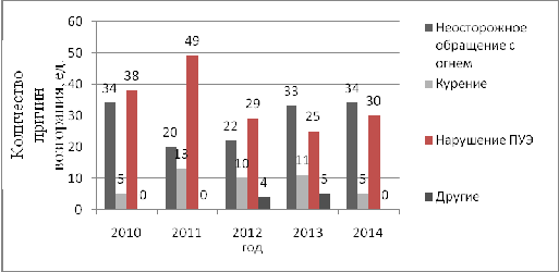 Среди общего показателя количества пожаров 2010-2014 гг. видно, что основными причинами возникновения пожаров являются нарушение ПУЭ и неосторожное обращение с огнем.