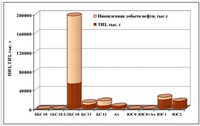 Динамика текущих извлекаемых запасов по объектам месторождения свидетельствует о лучшей выработке более высокопродуктивных объектов БС102-3 и БС12. Выработка остальных объектов (БС11, ЮС1, ЮС2, БС16-22) идет более медленными темпами. На 1.01.2012 г. по объекту БС102-3 отобрано 73% от начальных извлекаемых запасов, по объекту БС11 - 33.3%, по БС12 - 61.9%, по ЮС1 - 22.2%, по ЮС2 - 3.9%, БС16-22 - 2%.