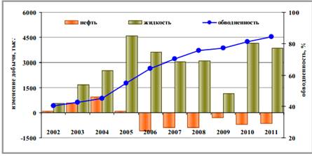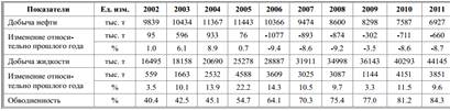 Таблица 2.2 Изменение добычи нефти и жидкости за период 2002-2011 гг. Тевлинско-Русскинское месторождение