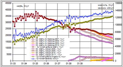 Рисунок 1.5 Динамика суточной добычи нефти по переходящим скважинам прошлых лет и новым скважинам 2008-2011 гг. ввода.