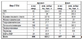 На 2011 г. по месторождению проектом было предусмотрено проведение геолого-технических мероприятий в объеме 606 скважино-операций с эффективностью 625.2 тыс. т. По запланированным видам ГТМ выполнено 557 скважино-операций, дополнительная добыча нефти составила 895 тыс. т, таблица 1.9.