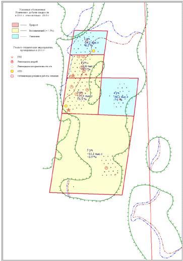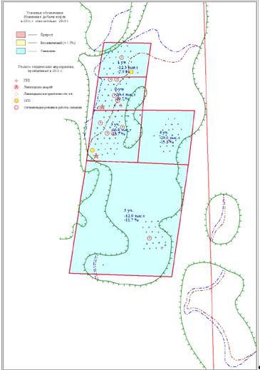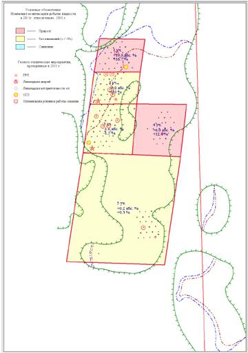 Рисунок 3.3 Карта охвата ГТМ в 2011 г. на схеме размещения участков с изменениями добычи нефти. Тевлинско-Русскинское месторождение. Объект БС11