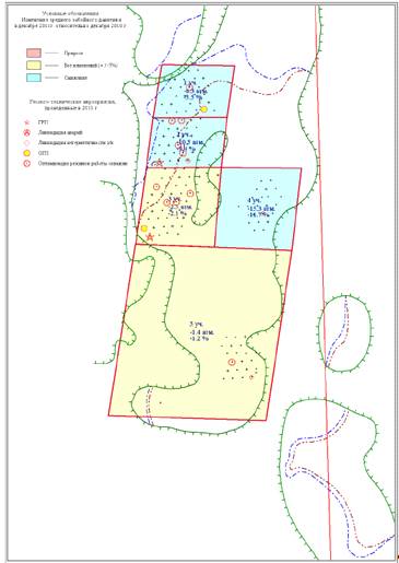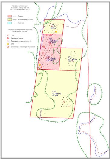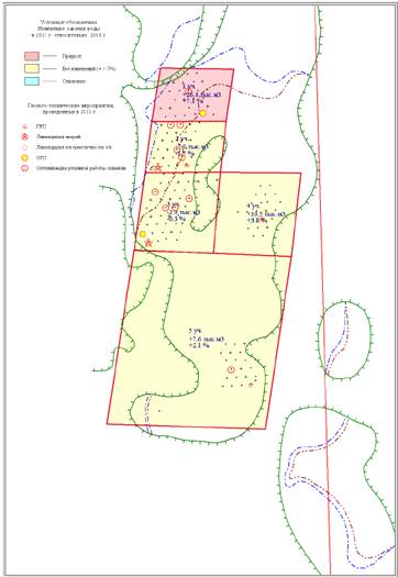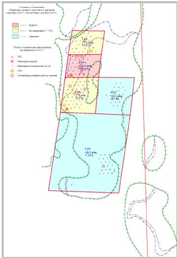 Рисунок 3.10 Карта охвата ГТМ в 2011 г. на схеме размещения участков с изменениями среднего динамического уровня. Тевлинско-Русскинское месторождение. Объект БС11