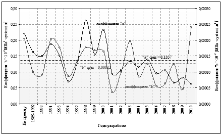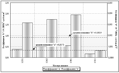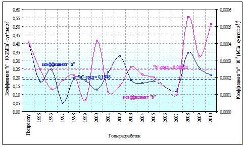 Формулы для определения коэффициентов а и b численным методом при неизвестном пластовом давлении имеют