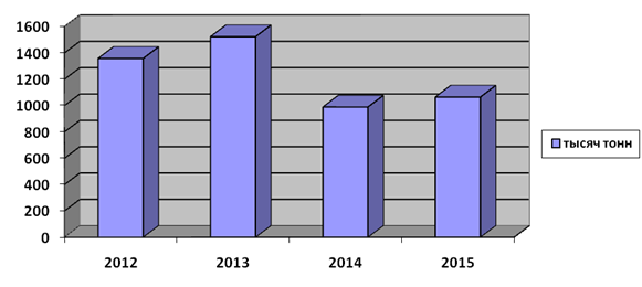 Динамика сливочного масла снижается, хотя в середине 1970-х годов ежегодно производство топленых жиров составляло 180-200 тыс.тонн. а отрасль относилась к стратегически важным. Объем российского производство сливочного масла в 2012 году составил 1 358 тонн, в 2013 г.- выросла 11,% и достиг 1523 тонн. В 2014 г произошел спад на 35 % до 989 тонн , и в 2015 г. – вырос на 7% и составил 1 065 тонн . Производства сливочного масла показано на рисунке 1 [6].