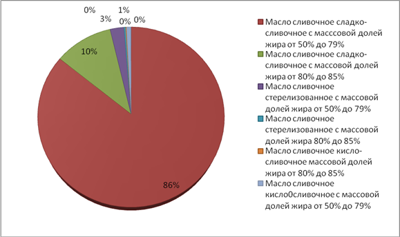 В структуре рынка масла России 86,32 % занимает масло сливочное сладко-сливочное с массовой долей жира от 50 % до 79 % с объемом производства в 2015 году в 185 тыс. тонн, дальше идет масло сливочное сладко-сливочное с массовой долей жира от 80 % до 85 % с объемом в 22,7 тыс. тонн, на третьем месте масло сливочное стерилизованное с массовой долей жира от 50 % до 79 % - 5,4 тыс. тонн, на четвертом - масло сливочное стерилизованное с массовой долей жира от 80 % до 85 % - 654 тонн, на пятом - масло сливочное кисло-сливочное с массовой долей жира от 80 % до 85 % - 321 тонна, и на шестом - масло сливочное кисло-сливочное с массовой долей жира от 50 % до 79 % - 172 тонны и масло сливочное подсырное –187 тонн. Структура сливочного масла в России представлена на рисунке 2.
