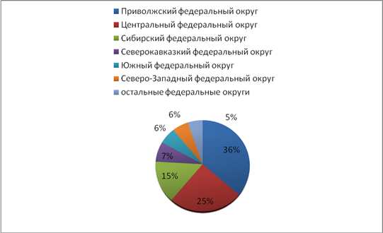 Первое место по производству масла сливочного является Приволжский ФО, доля которого составляет - 36,4%, второе место занимает Центральный ФО - 24,7%, третье место Сибирский ФО - 14,8%, четвертое место Северокавказский ФО - 7,2%, пятое место Южный ФО- 5,9%, шестое место Северо-Западный ФО - 5,7% и седьмое место занимают остальных федеральных округов -5,3%. Доли объема производства масла сливочного Федеральных округов РФ в 2013 представлены на рисунке 3[13].
