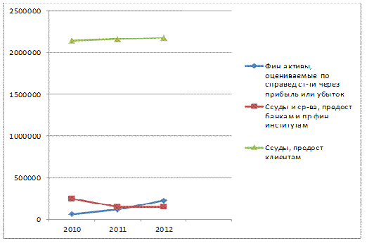 Не смотря на такое изменение удельного веса, ссуды, предоставленные клиентам, год от года увеличиваются в количественном отношении, то есть, если в 2010 году это 2144782 млн тг, в 2011 году - 2160767 млн тг, то в 2012 количество их выросло до 2174760 млн тг. Что касается второго места в предложенной структуре баланса, здесь видно, что в 2010 и 2011 году оно принадлежало статье «ссуды и средства, предоставленные банкам и прочим финансовым институтам», что составляет 9,25% и 5,73% соответственно.