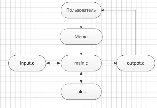Программа разделена на следующие составляющие модули: .c - основной модуль, содержащий в себе главную функцию программы - функцию main, в которой происходит вызов функций, выполняющих стоящие перед программой задачи, объявление переменных, а так же реализация меню, которое делает доступ к использованию функций программы простым, быстрым и доступным обычному пользователю (далее клиент). Функция main разрабатывалась так, чтобы в ней содержалось как можно меньше кода. Это нужно для того, чтобы любой не знакомый с программой программист, открывший код данной программы мог легко и быстро в нем разобраться..c - модуль, содержащий реализацию функции menu, которая выполняет две задачи: 1) выводит на консоль список команд, выполняемых программой (каждой команде соответствует определенный номер в списке, который клиент вводит с клавиатуры при работе с программой) 2) возвращает значение, введенное с клавиатуры клиентом. Далее это значение передается оператору switch, осуществляющему работу меню, то есть возможность запуска выбранной команды. Запуск выбранной команды осуществляется путем вызова соответствующей выбранной команде функции программы. Приведем список команд, доступных в меню: