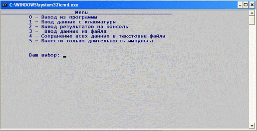 В меню так же предусмотрена защита от ввода некорректных чисел при выборе номера команды, так же имеется защита от некорректного выбора команды на данном этапе работы (например, клиент выберет вывод расчетов, не вводя перед этим рабочие данные).c - этот модуль содержит в себе функции, отвечающие за ввод рабочих данных. Модуль позволяет вводить данные с клавиатуры и считывать данные из текстового файла..c - модуль, отвечающий за вывод расчетов. Позволяет выводить расчетные данные на консоль и производит запись данных в текстовый файл. .c - модуль, осуществляющий решение поставленной перед программой задачи, заполнения массива времени, массивов входного и выходного напряжения, а так же вычисления длительности импульса входного и выходного сигнала.