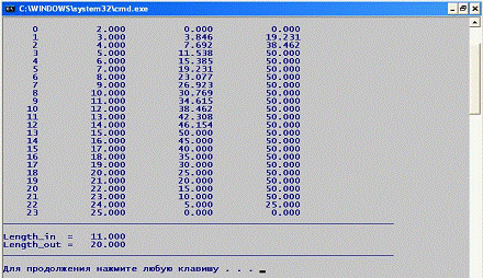 Функция, которая выводит сформированные массивы на консоль в виде таблицы. Происходит это с помощью цикла for и функции printf . Так же функция выводи длительность импульса. В этой функции реализована проверка с переменной zapolneno, суть которой, как говорилось выше, сводится к тому, чтобы сравнить количество удачно прочитанных при вводе рабочего набора переменных и количество переменных по условию задачи (в 24ом варианте их 7). Если переменная zapolneno равна 7, то программа продолжает работать, если нет , то выводит соответствующее сообщение._output_source_data