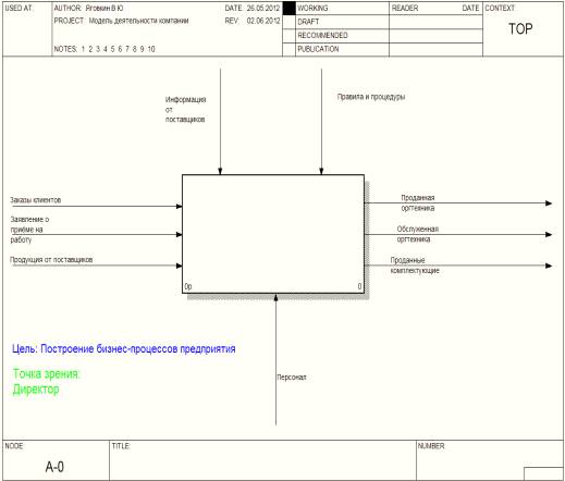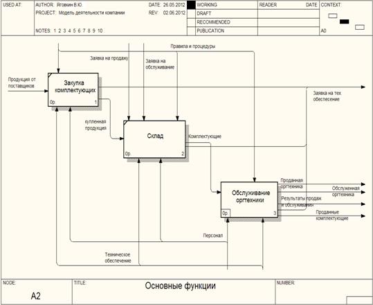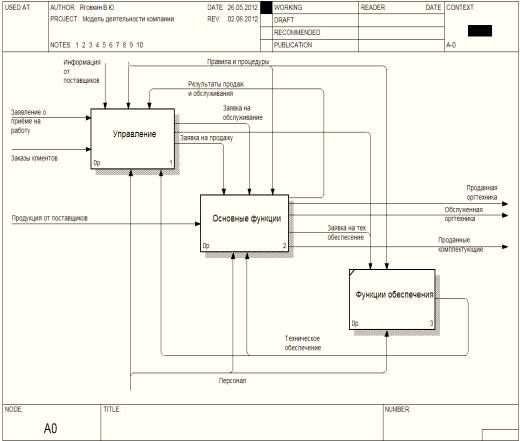 Заявлениями о приёме на работу, заказами клиентов занимается “Управление”, также выходом являются: заявка на обслуживание, из “Управления” в “Основные функции”. Продукция от поставщиков поступает в “Основные функции”, а выходом являются проданная продукция. Также во все функции поступают правила и процедуры. В функции обеспечения поступает заявка на техническое обслуживание, таким образом выходом является техническое обеспечение. Результаты продаж и обслуживания выходят из “Основных функций” и входят в “Управление”.