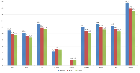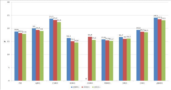 Диаграмма занятости в государственном секторе региональном разрезе (рис. 1) показывает, что наибольший удельный вес занятых в государственном секторе в 2009-2011 гг. отмечается в Дальневосточном и Северо-Западном федеральных округах, а наименьший - в Поволжском, Южном, Уральском и Северокавказском федеральных округах. При этом снижение доли занятых в государственном секторе в исследуемом периоде отмечается во всех федеральных округах.