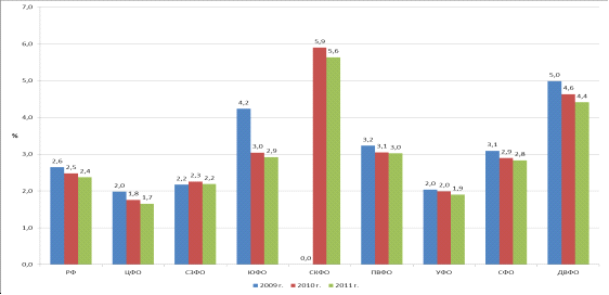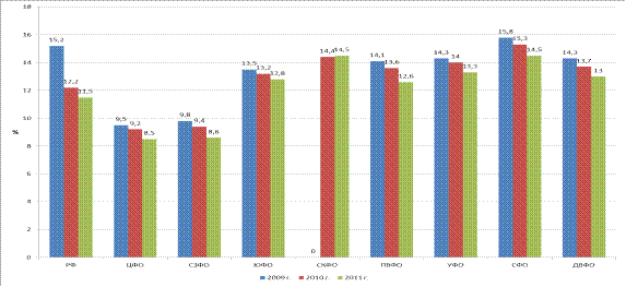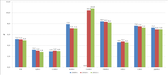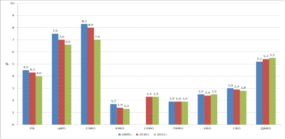 Диаграмма занятости в муниципальном секторе региональном разрезе (рис. 2) показывает, что наибольший удельный вес занятых в муниципальном секторе в 2009-2011 гг. отмечается в Сибирском и Северокавказском федеральных округах, а наименьший - в Центральном, и Северо-Западном федеральных округах. При этом снижение доли занятых в государственном секторе в исследуемом периоде отмечается во всех федеральных округах, за исключением Северокавказского.