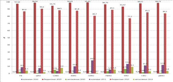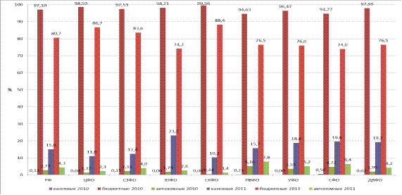 Из диаграммы (рис. 5) видно, что по всем округам в государственном секторе преобладают бюджетные предприятия, но их удельный вес снижается на фоне роста доли казенных и автономных предприятий. Наибольший удельный вес бюджетных предприятий отмечается в Северокавказском и Центральном округах, а наименьший - в Южном и Сибирском, где отмечается наибольший удельный вес казенных предприятий.
