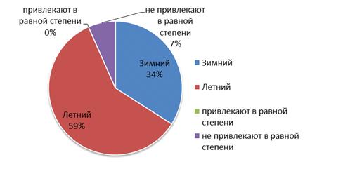 На данный вопрос анкеты большее количество людей (59%) ответило, что предпочитают летний вид туризма, 34 % ответило, что зимний, остальных респондентов не привлекает ни один вид активного туризма.