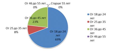 В анкетировании принимали участие люди разных возрастных категорий, но возраст большинства опрашиваемых людей (69%) находится в пределах от 18 до 24 лет.