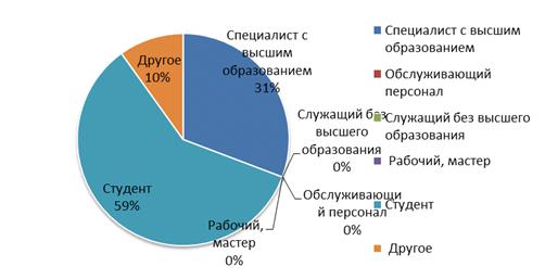 Большее количество опрошенных людей являются специалистами с высшим студентами (59%), 31% опрошенных - специалисты с высшим образованием. И среди участников анкетирования нет служащих, без высшего образования, либо рабочих.