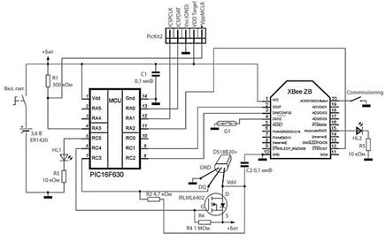 В качестве примера конечного спящего устройства рассмотрим беспроводной датчик температуры, состоящий из модуля XBee, простого 8-разрядного микроконтроллера (МК) PIC16F630 и популярного цифрового датчика температуры DS18B20, схема которого изображена на рисунке 3.5. Датчик работает в ZigBee-сети, являясь дочерним
