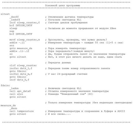 Схема реализует следующий алгоритм работы: . Модуль XBee работает как конечное спящее устройство. . При каждом просыпании (каждые 5 с), модуль XBee устанавливает в 0 линию CTS, что является источником прерывания для МК, находящегося в режиме Sleep. . При каждом прерывании МК увеличивает на 1 свой внутренний счетчик. . На каждом 11 прерывании подается питание на DS18B20, и запускается цикл измерения температуры длительностью ~ 750 мс. Измеренное значение сохраняется, и МК снова уходит в режим сна. . На каждом 12 прерывании измеренная температура отправляется на координатор в виде API-пакета. Внутри пакета температура представлена в текстовом виде (ASCII). После отправки температуры с помощью команды SI