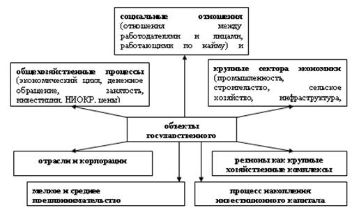 Объектами государственного воздействия на экономику являются те условия, процессы и отношения, происходящие в сфере общественного воспроизводства, функционирование которых рыночный механизм обеспечивает неудовлетворительно или не обеспечивает вообще. По уровню решаемых задач можно выделить следующие объекты государственного воздействия, представленные нами на рис. 1.