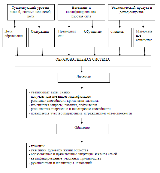 На рынке образовательных услуг основными субъектами экономических отношений являются производители и потребители. Общество и государство в качестве потребителей ожидают развитие экономики страны, рост благосостояния граждан, повешение уровня культуры и образованности, социальной и политической грамотности посредствам обучения и воспитания активных, всесторонне развитых, зрелых членов общества. На рисунке № 1 представлена схема взаимодействия общества и образовательной системы. [9]