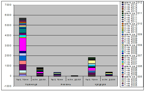 По данным таблицы видно, что наибольшая доля импорта приходится на ячмень и кукурузу, а наименьшая на пшеницу. Импорт пшеницы в период с 2005 по 2008 гг. увеличивался, а с 2009 году произошел спад импортируемого зерна и он продолжался до 2010 года, такой спад импорта в 2009 году объясняется кризисной ситуацией в стране и мире, но в 2012 году ситуация немного улучшилась и импорт данного товара увеличился.