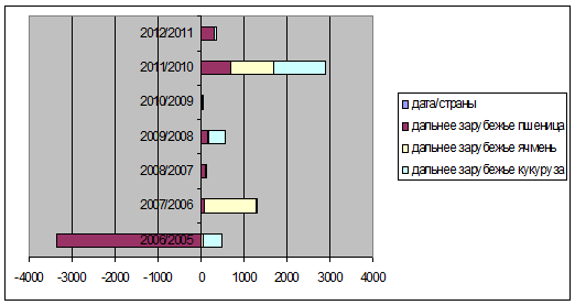 Импорт пшеницы сократился в физическом выражении на 95,6 %, в стоимостном - на 75 %; импорт кукурузы в физическом выражении сократился на 27,4 %, в стоимостном возрос - на 41,4 %; в то время как импорт ячменя увеличился в физическом выражении почти в 2 раза, в стоимостном - в 3,1 раза.