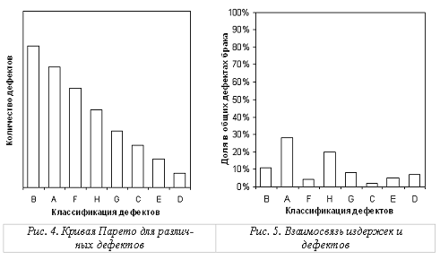 На рис. 4 определяется дефект, приводящий к наибольшему числу отказов, но последующие графики (рис. 5, 6 и 7) показывают, что область наибольшего числа дефектов не соответствует области наибольших издержек для компании, вызываемых браком, поскольку имеющая этот дефект деталь гораздо дешевле, менее важна или легче поддается исправлению. Если деталь изготавливается в гораздо большем количестве по сравнению с остальными, то число дефектов этого вида может ввести в заблуждение, так как большое абсолютное число может составить в данном случае низкий процент. Например, 5% случаев отказа из 10 000 деталей составляет 500 случаев брака, но 20% из 1 000 деталей - «всего лишь» 200 случаев.