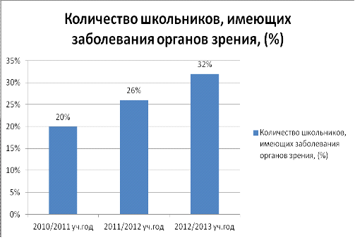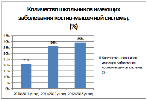 Полученные результаты показали, что к 2013 году на 18 % увеличилось количество младших школьников, имеющих заболевания костно-мышечной системы, и на 12 % увеличилось количество младших школьников, имеющих заболевания органов зрения. Это может быть связано, как и с физиологическими отклонениями каждого индивидуально, так и многими другими причинами, влияющими на здоровье современных школьников. Одной из причин можно считать современное увлечение детей дошкольного возраста компьютерными играми. Бесконтрольное проведение времени перед монитором пагубно влияет на зрение, отсюда и такие результаты.