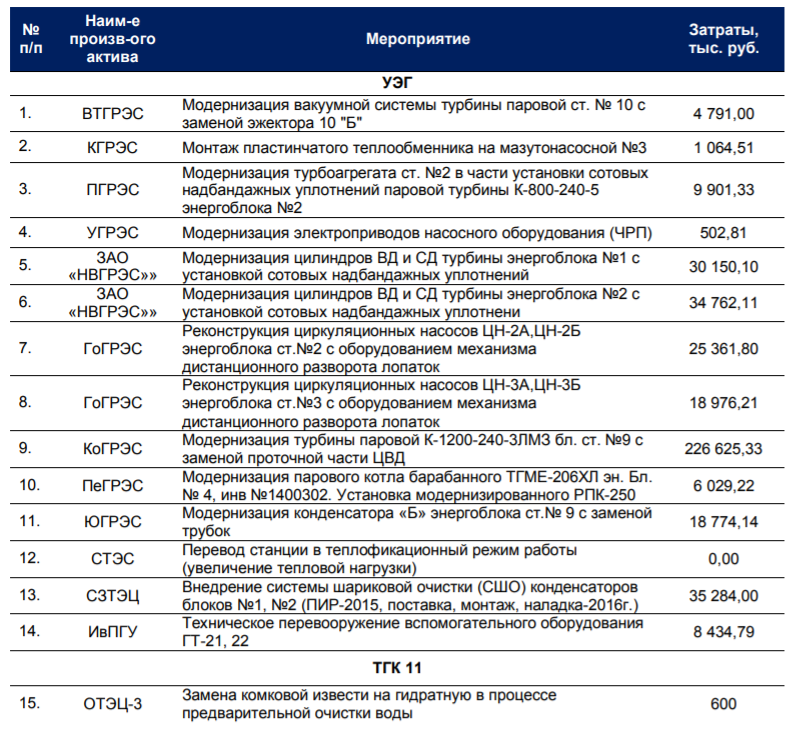 Мероприятия модернизации действующих мощностей. В рамках среднесрочной Инвестиционной программы Группы «Интер РАО» на 2015-2019 годы планируется реализация масштабных проектов по модернизации и строительству новых генерирующих мощностей, обеспечивающих в период до 2018 г. прирост установленной мощности в количестве 2 496 МВт.