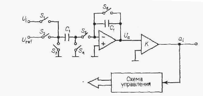 Работа схемы во время i-гo периода интегрирования происходит следующим образом. В фазе 1 ключи S1 и S4 замкнуты, в результате чего конденсатор bC1 заряжен до напряжения Ui. В фазе 2 замкнуты ключи S3 и S5, благодаря чему заряд с конденсатора bC1 будет перенесен на конденсатор С1. Напряжение на выходе интегратора определяется следующим образом: