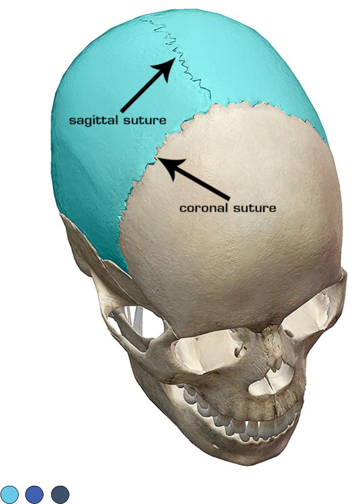 A suture is a fibrous joint found only in the skull. The parietal bones (in blue) come together to form the sagittal suture and also form the coronal suture with the frontal bone.