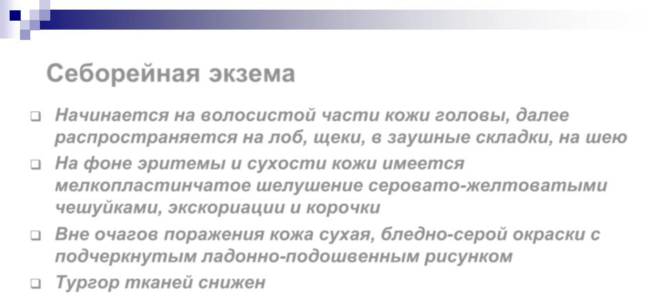 На фоне эритемы и сухости кожи имеется мелкопластинчатое шелушение серовато-желтоватыми чешуйками, экскориации и корочки
