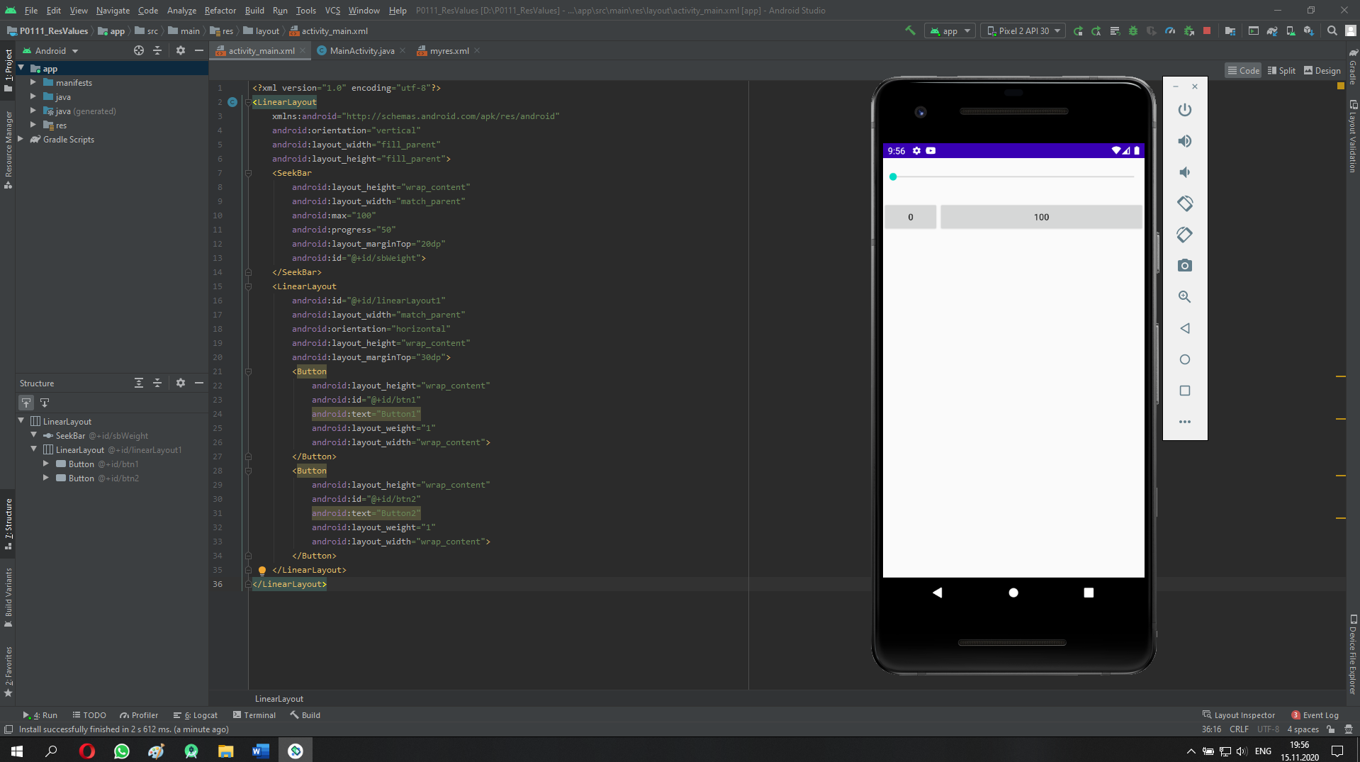 <?xml version="1.0" encoding="utf-8"?> <LinearLayout xmlns:android="http://schemas.android.com/apk/res/android" android:orientation="vertical" android:layout_width="fill_parent" android:layout_height="fill_parent"> <SeekBar android:layout_height="wrap_content" android:layout_width="match_parent" android:max="100" android:progress="50" android:layout_marginTop="20dp" android:id="@+id/sbWeight"> </SeekBar> <LinearLayout android:id="@+id/linearLayout1" android:layout_width="match_parent" android:orientation="horizontal" android:layout_height="wrap_content" android:layout_marginTop="30dp"> <Button android:layout_height="wrap_content" android:id="@+id/btn1" android:text="Button1" android:layout_weight="1" android:layout_width="wrap_content"> </Button> <Button android:layout_height="wrap_content" android:id="@+id/btn2" android:text="Button2" android:layout_weight="1" android:layout_width="wrap_content"> </Button> </LinearLayout> </LinearLayout>