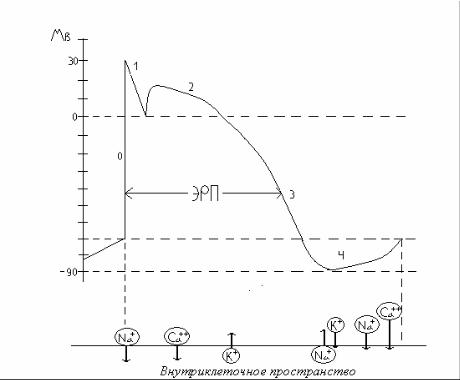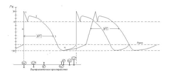 Впейсмекерских клетках в период покоя возникает спонтанная деполяризация кальциевого типа (фаза 4), ионы натрия и кальция медленно входят в клетку. После достижения пороговой величины деполяризации (-60 мВ), проницаемость для этих ионов резко увеличивается, и они проникают через быстрые каналы, развивается быстрая деполяризация (фаза 0), и потенциал действия достигает положительного значения +30 мВ (овершут).