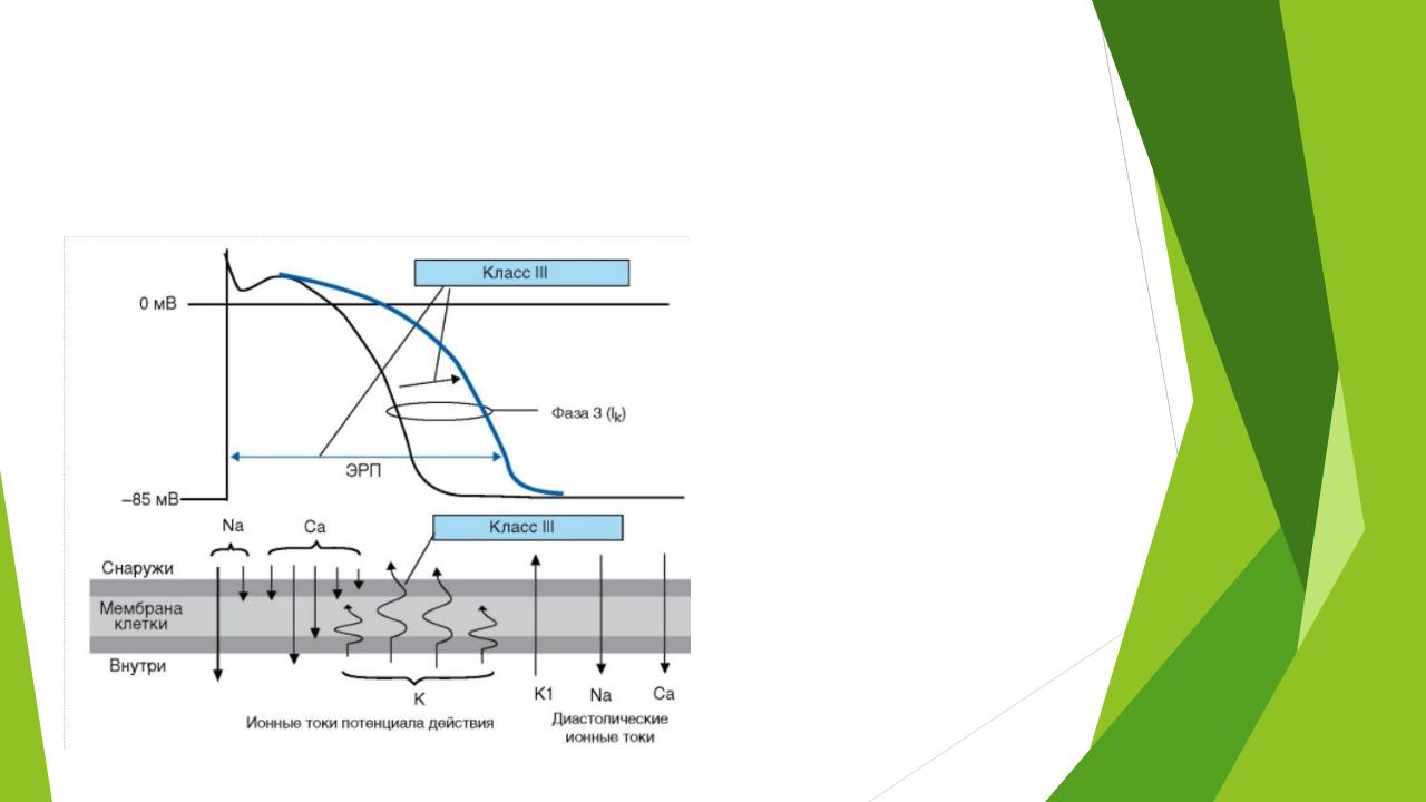 Основным электрофизиологическим свойством ААП III класса являются блокада калиевых каналов и замедление калиевого тока, что приводит к увеличению ППД и ЭРП в ткани предсердий и желудочков. ААП III класса подавляют автоматизм.