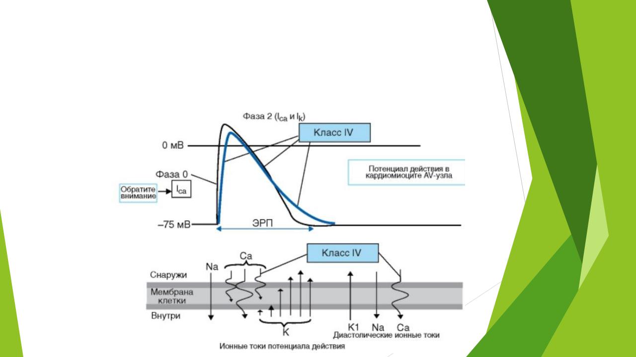 БМКК (верапамил и дилтиазем) блокируют медленные кальциевые каналы, которые в основном определяют скорость деполяризации - СА- и АВ-узлов. БМКК подавляют автоматизм, замедляют проведение и увеличивают рефрактерность СА- и АВ-узлов. Медленные кальциевые токи могут быть необходимым компонентом развития следовых деполяризаций. БМКК способны подавлять следовые деполяризации и могут быть эффективны при триггерных аритмиях. Они также обладают антиишемическим и гипотензивным свойствами.