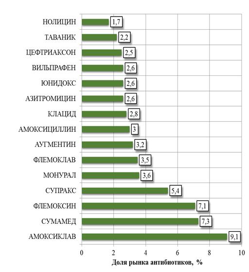 Как видно из данных рисунка 2, согласно рейтингу продаж, в натуральном выражении в первом полугодии 2016 года в российских аптеках наиболее популярными антибиотиками с долей рынка в 4% и более, стали бренды: